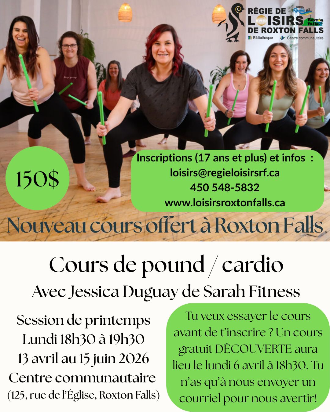 Tu veux essayer le cours avant de t’inscrire ? Un cours gratuit DÉCOUVERTE aura lieu le lundi 6 avril à 18h30. Tu n’as qu’à nous envoyer un courriel pour nous avertir! loisirs@regieloisirsrf.ca