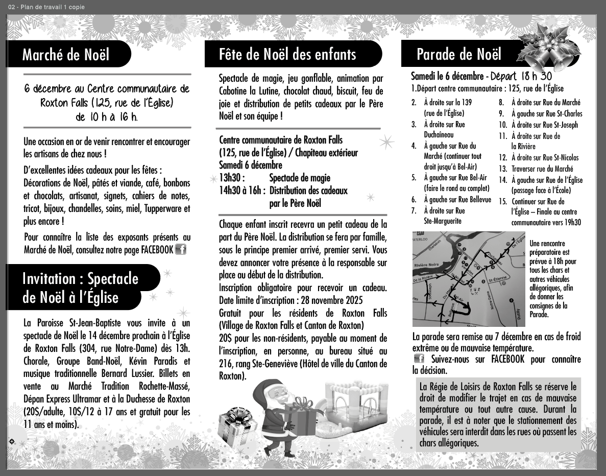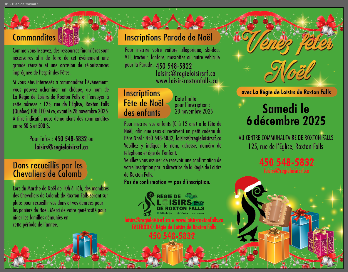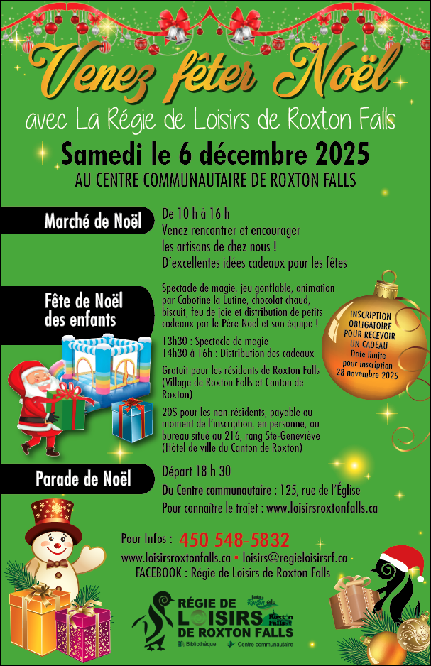 Vous devez inscrire vos enfants afin que ces derniers reçoivent un petit cadeau du Père Noël; inscription 450 548-5832 ou loisirs@regieloisirsrf.ca au plus tard le 28 novembre 2025.